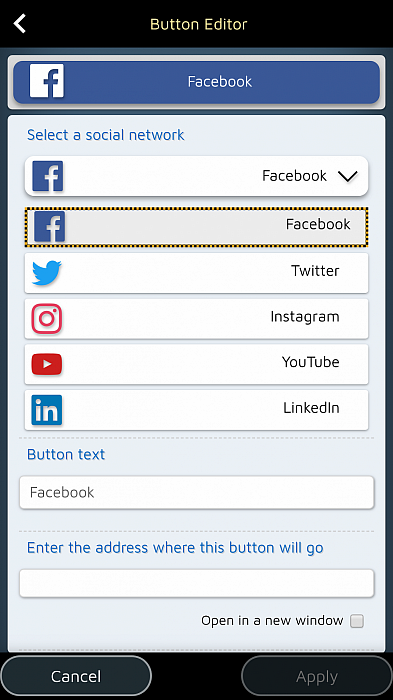 • Du kan skapa knappar för att uppmuntra dina besökare att gå till en specifik sida på din webbplats, att besöka din Facebook-sida eller att kontakta dig via dina favoriter kommunikationsapp.