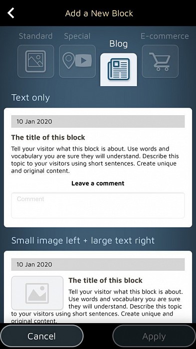 Smart-versionen har lagt till förinställningar för teckensnitt, färger på din webbplats och former på dina flikar och sidor.